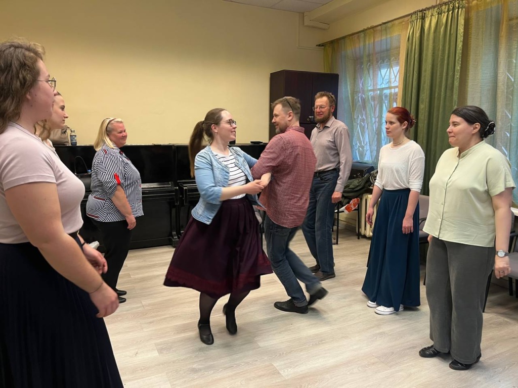 Инициативная группа из нескольких человек осваивали уральские кадрили под чутким наставничеством наших преподавателей.